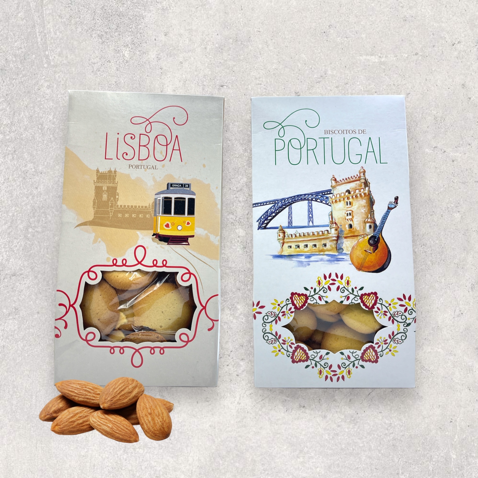 • Dois pacotes de biscoitos portugueses com ilustrações e janelas transparentes mostrando biscoitos e amêndoas ao lado
