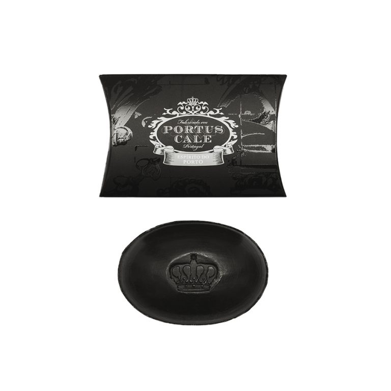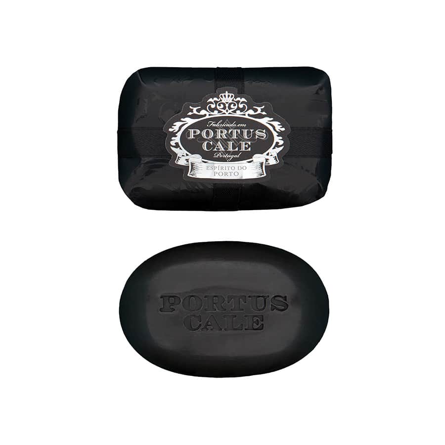 • Sabonete preto Portus Cale com embalagem preta e texto branco