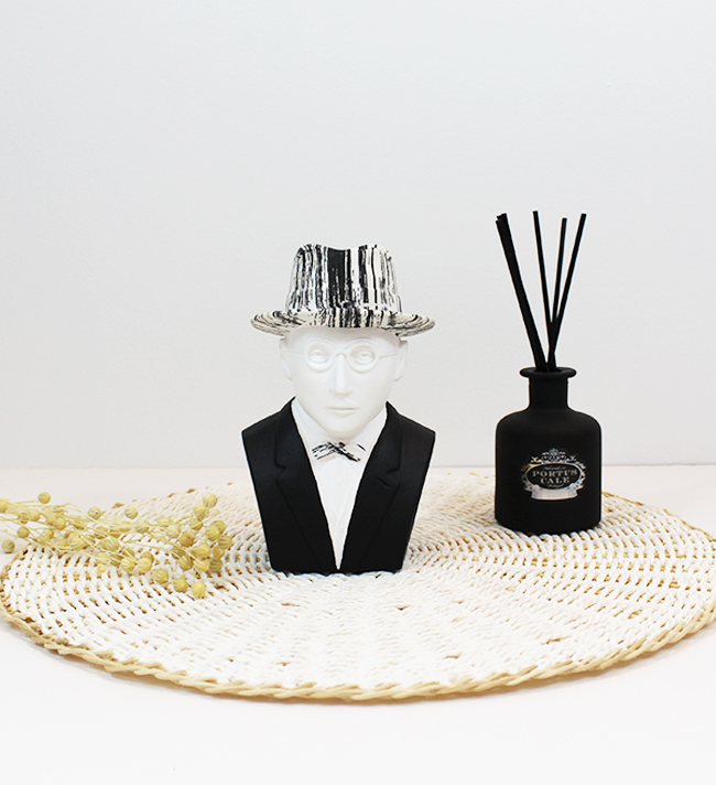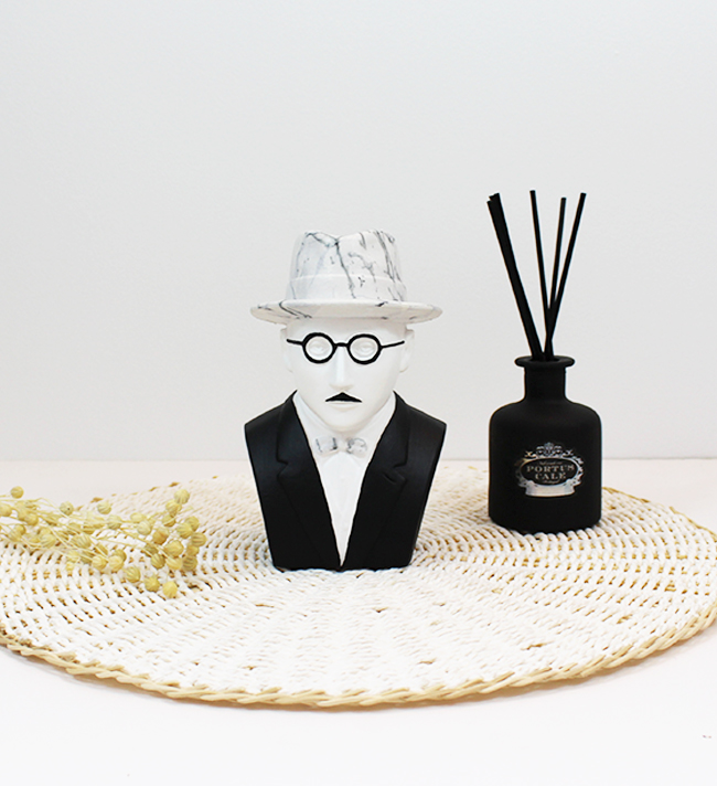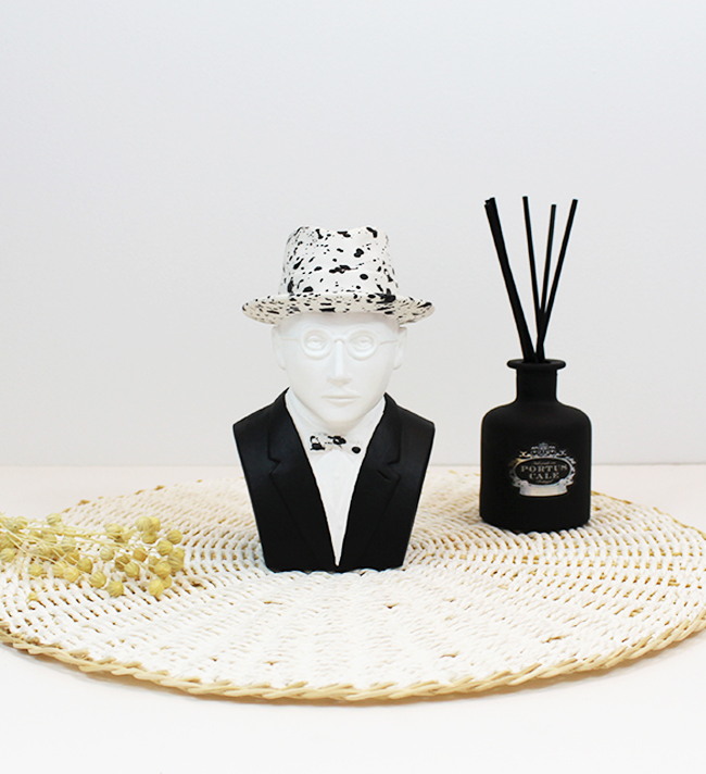 • Busto decorativo moderno com chapéu e óculos ao lado de difusor de aromas preto num cenário minimalista