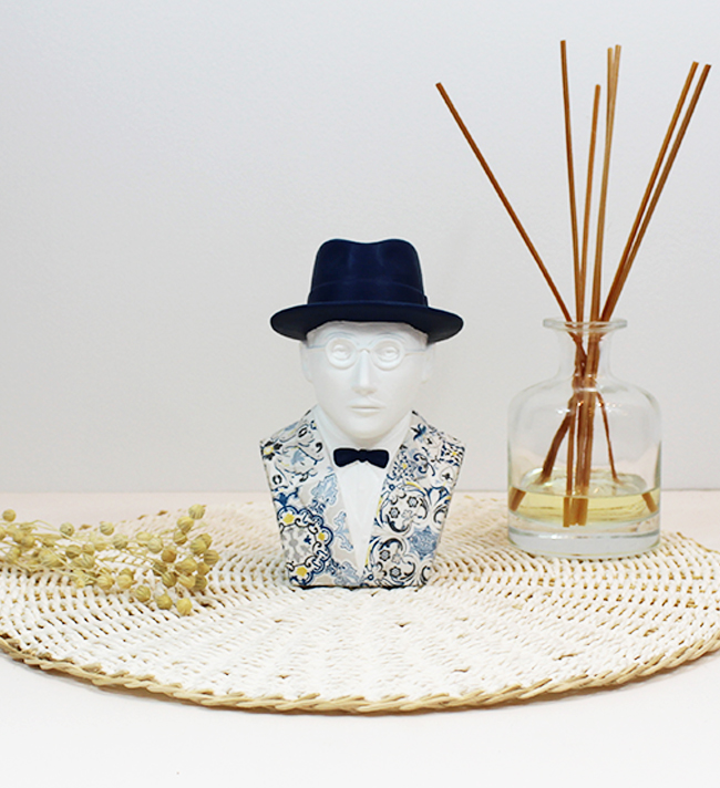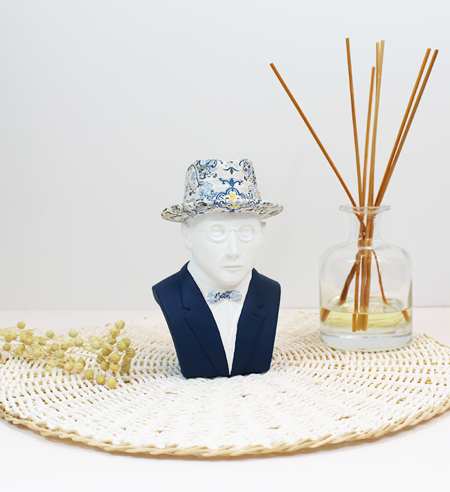 • Busto decorativo com chapéu e fato azul sobre base trançada com difusor aromático ao lado