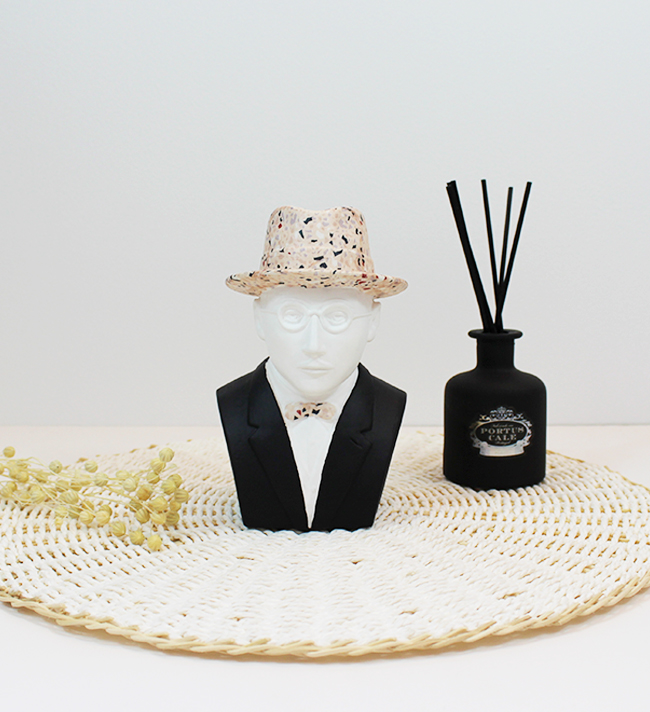 • Busto decorativo de homem com chapéu e gravata borboleta terrazzo e frasco difusor preto sobre base de ráfia