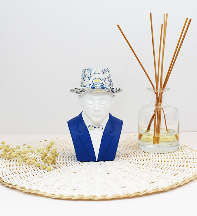 • Estátua decorativa de busto humano com chapéu com padrão azul ao lado de frasco de vidro com palitos de difusor