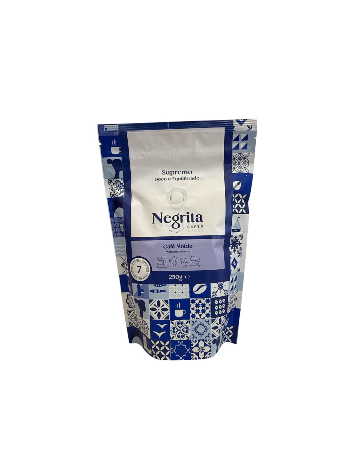 • Embalagem de café moído Negrita Supremo 250g azul e branco com padrões e texto