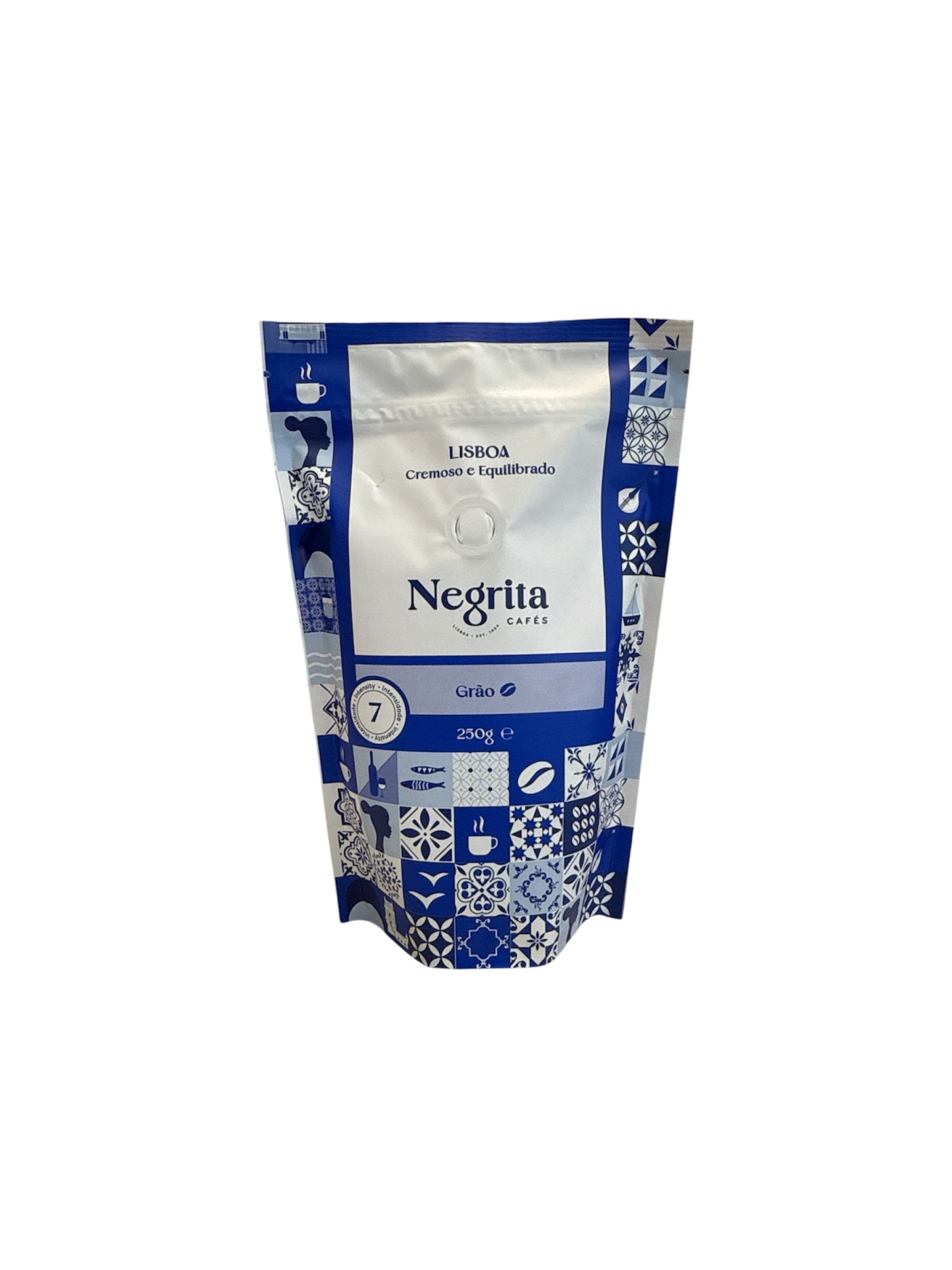 • Embalagem de café em grão Negrita Cafés Lisboa azul e branca
