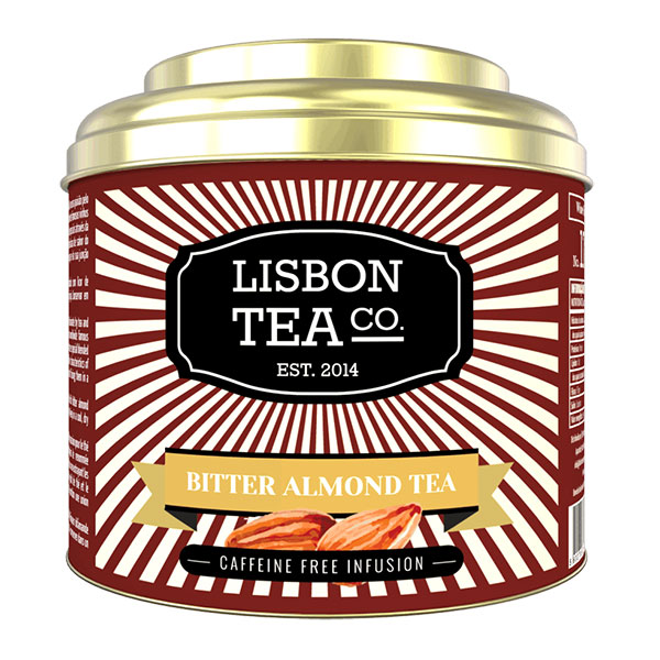 • Lata de chá Lisbon Tea Co. Bitter Almond Tea com embalagem vermelha e dourada