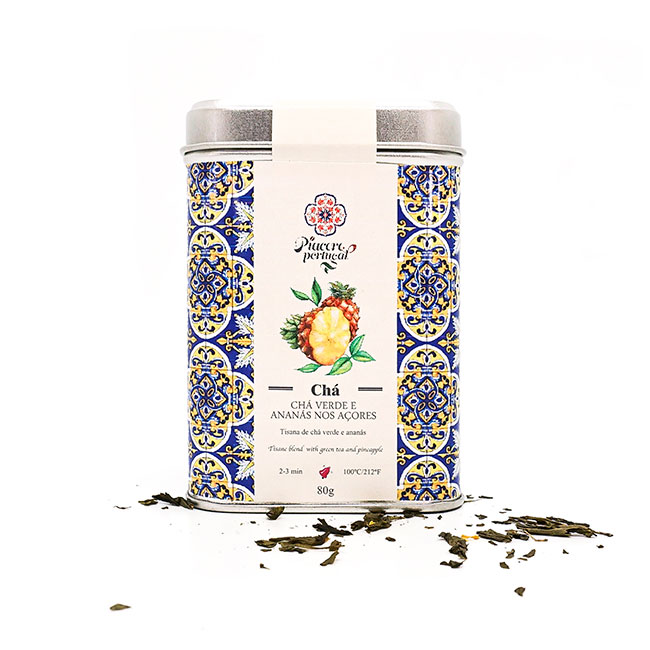 • Recipientes metálicos decorativos para chá verde com ananás nos Açores, com padrão azul e amarelo e rótulo branco