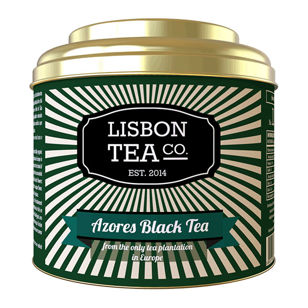 • Lata metálica de chá preto dos Açores com design verde escuro e dourado