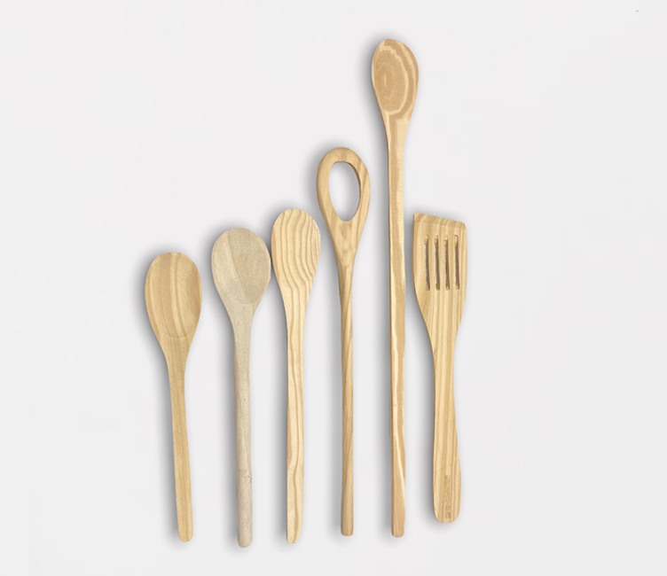 Utensílios de cozinha em madeira clara variados sobre fundo branco