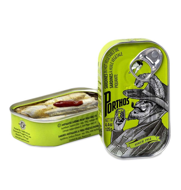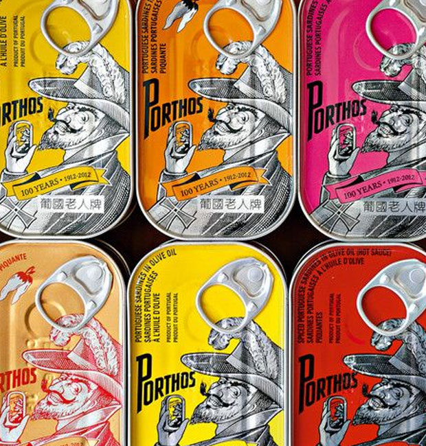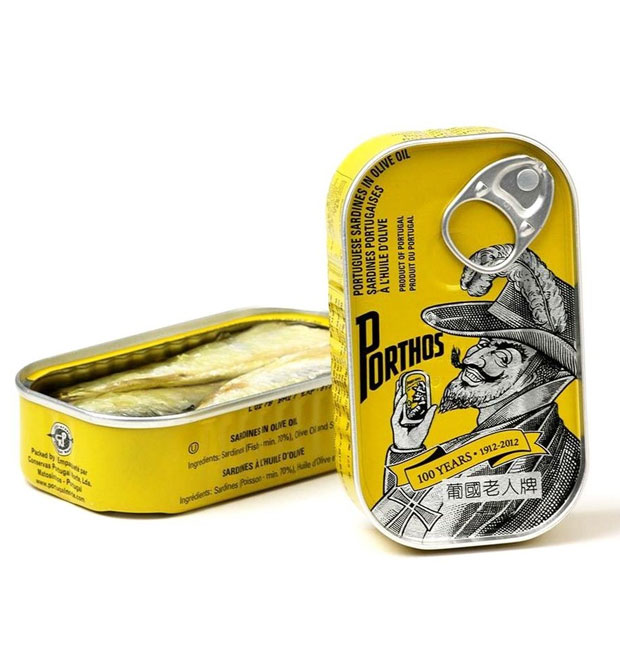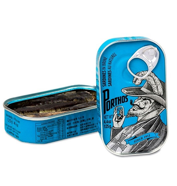 • Latas azuis de sardinhas em azeite da marca Porthos com rótulo ilustrado