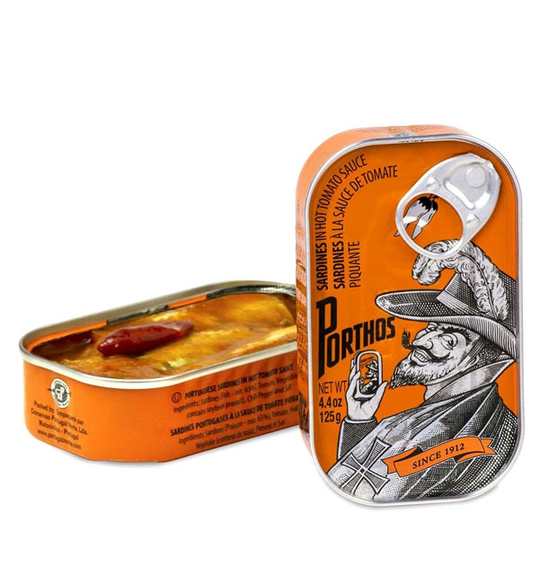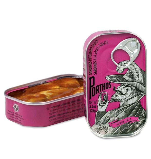 • Duas latas de sardinhas Porthos, uma aberta com molho de tomate, outra fechada com rótulo laranja e desenho de homem com chapéu