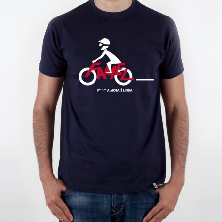 Camiseta azul escuro com estampa de motociclista e texto FAFÉ P*** A MOTA É LINDA