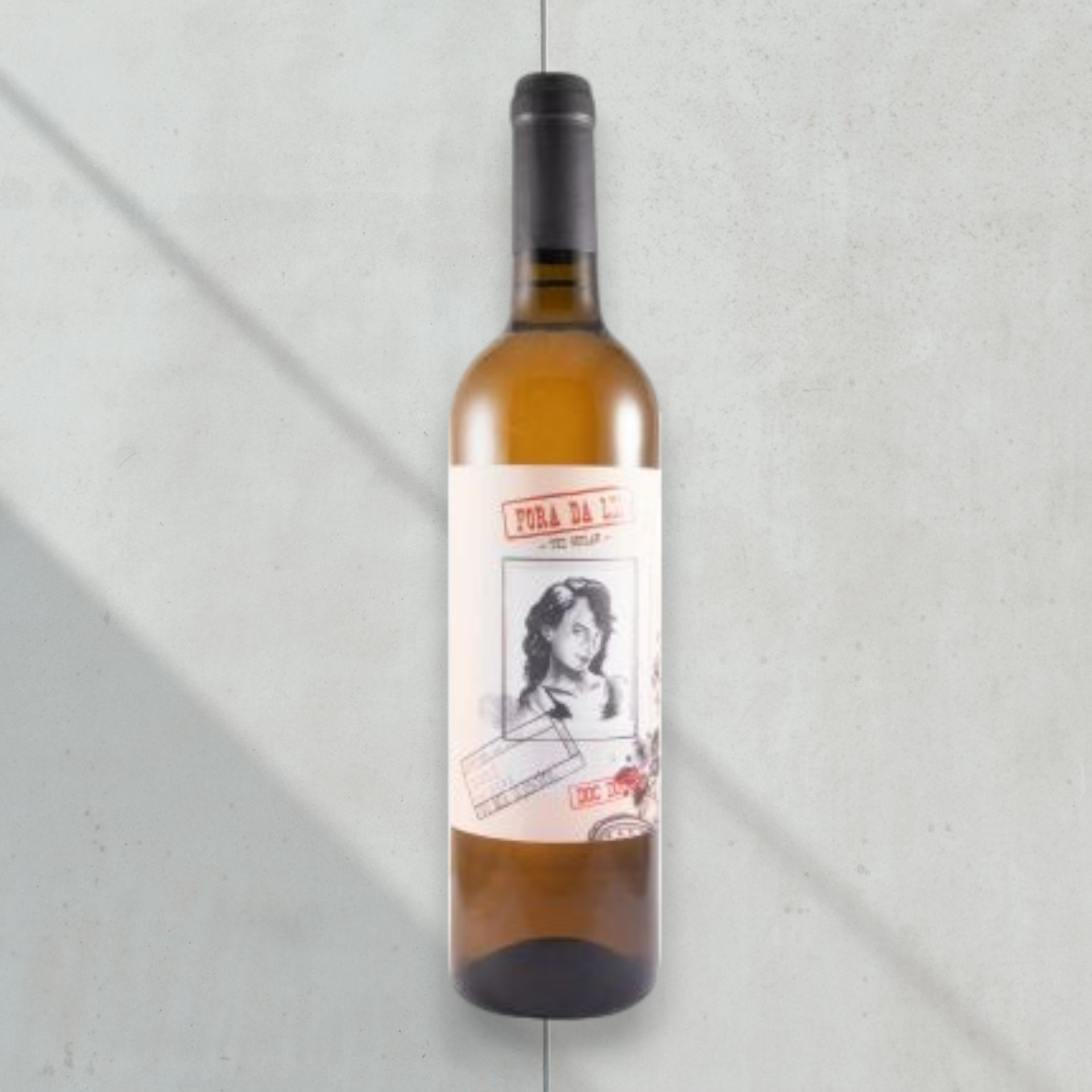 • Garrafa de vinho com rótulo branco e rolha preta com rótulo que mostra uma mulher e texto FORA DA LEI