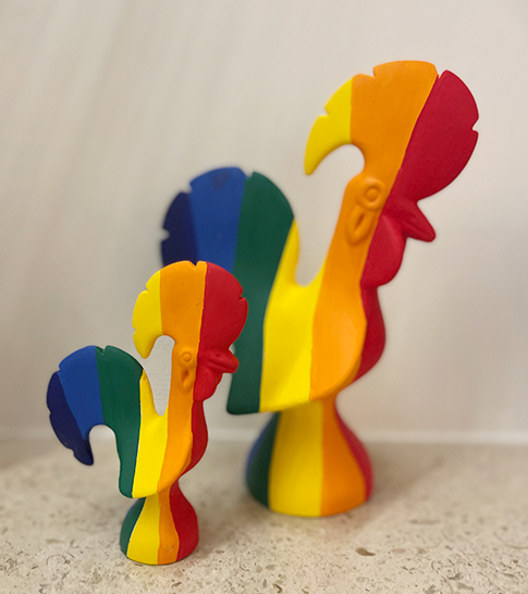 • Duas figuras decorativas de galo coloridas em madeira