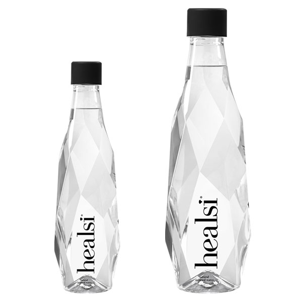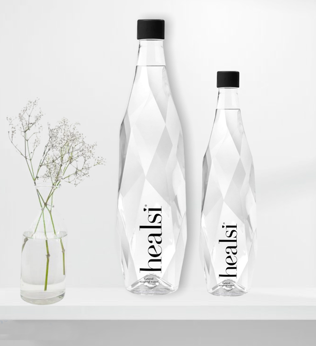 • Duas garrafas facetadas transparentes com tampa preta e texto 'healsi'.
