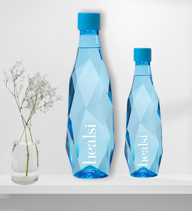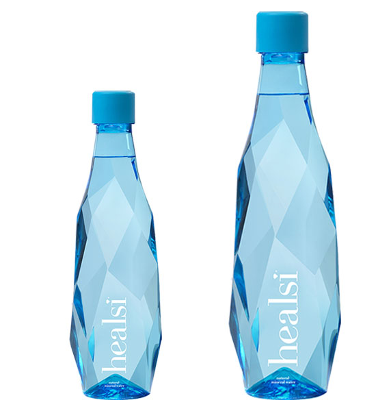 • Duas garrafas azuis de água mineral Healsi com tampa azul