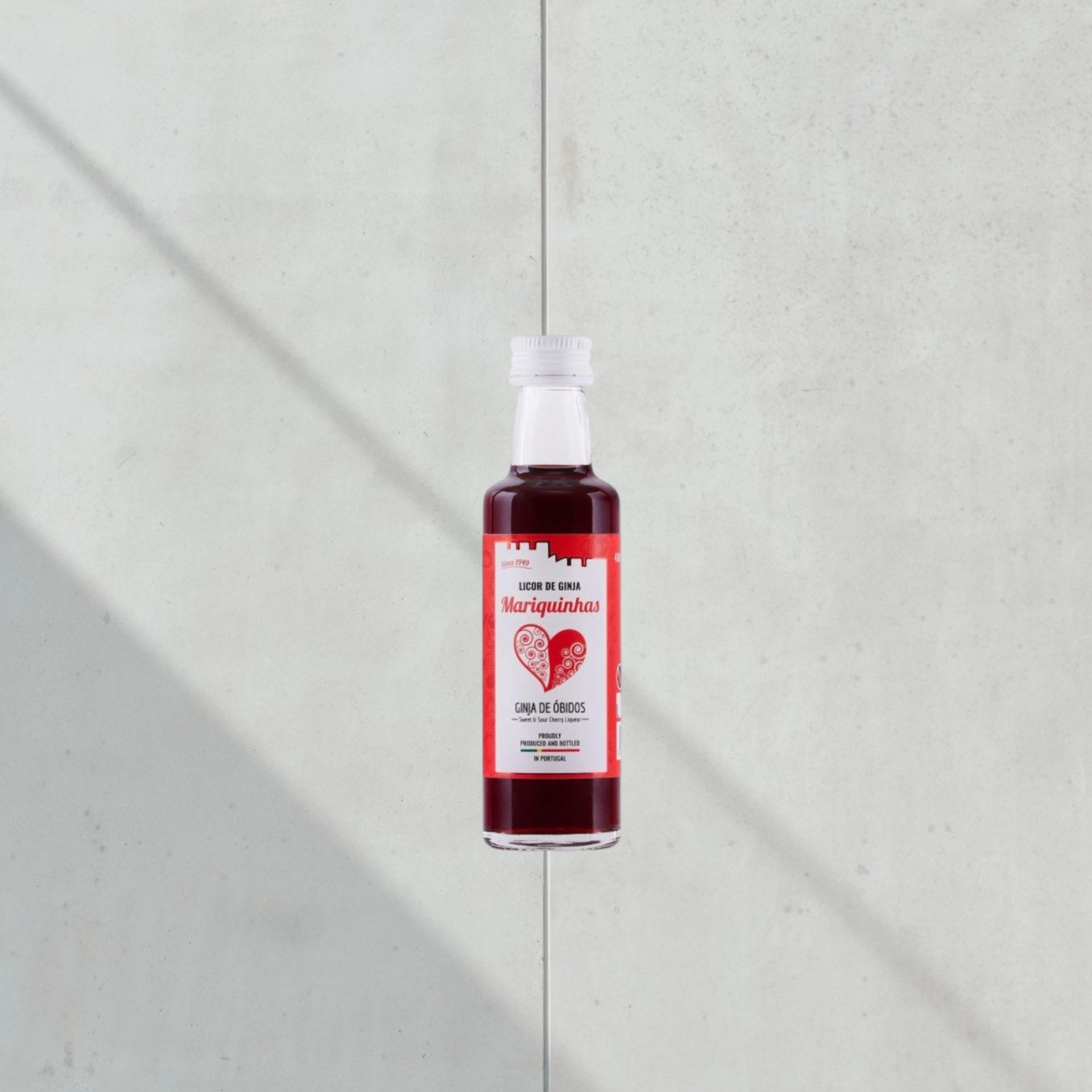 • Garrafa de licor de ginja Mariazinha com rótulo branco e vermelho