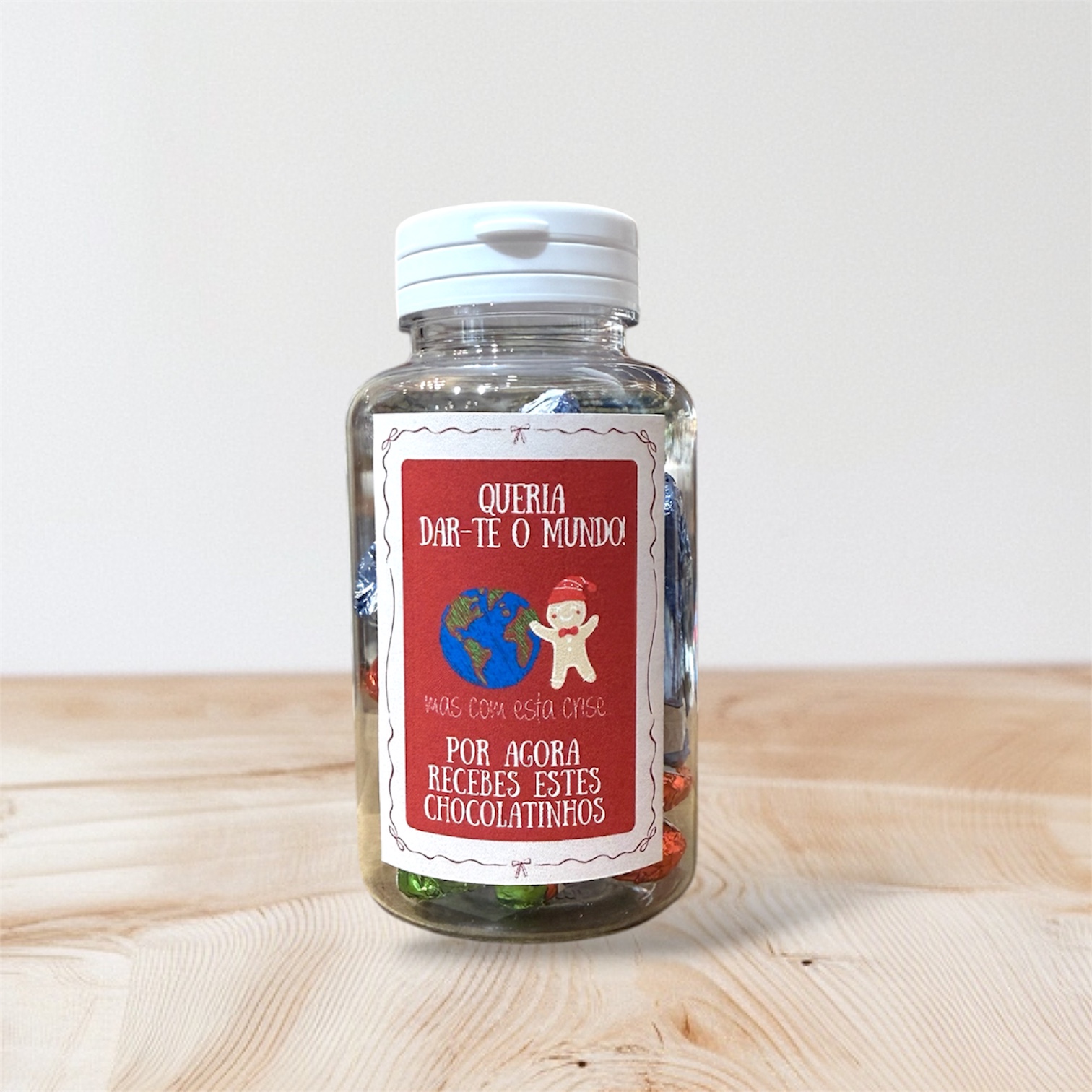 • Frasco de vidro com chocolates coloridos e etiqueta vermelha com texto em português.