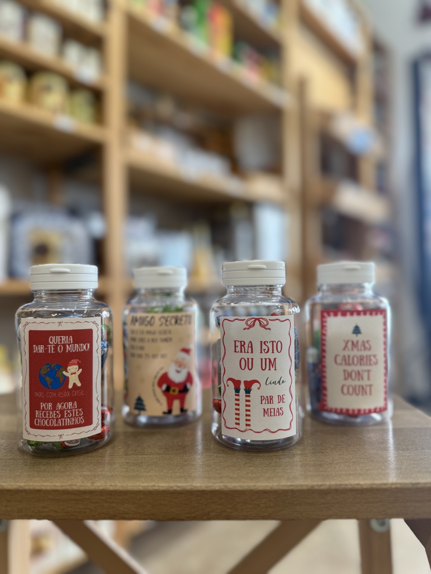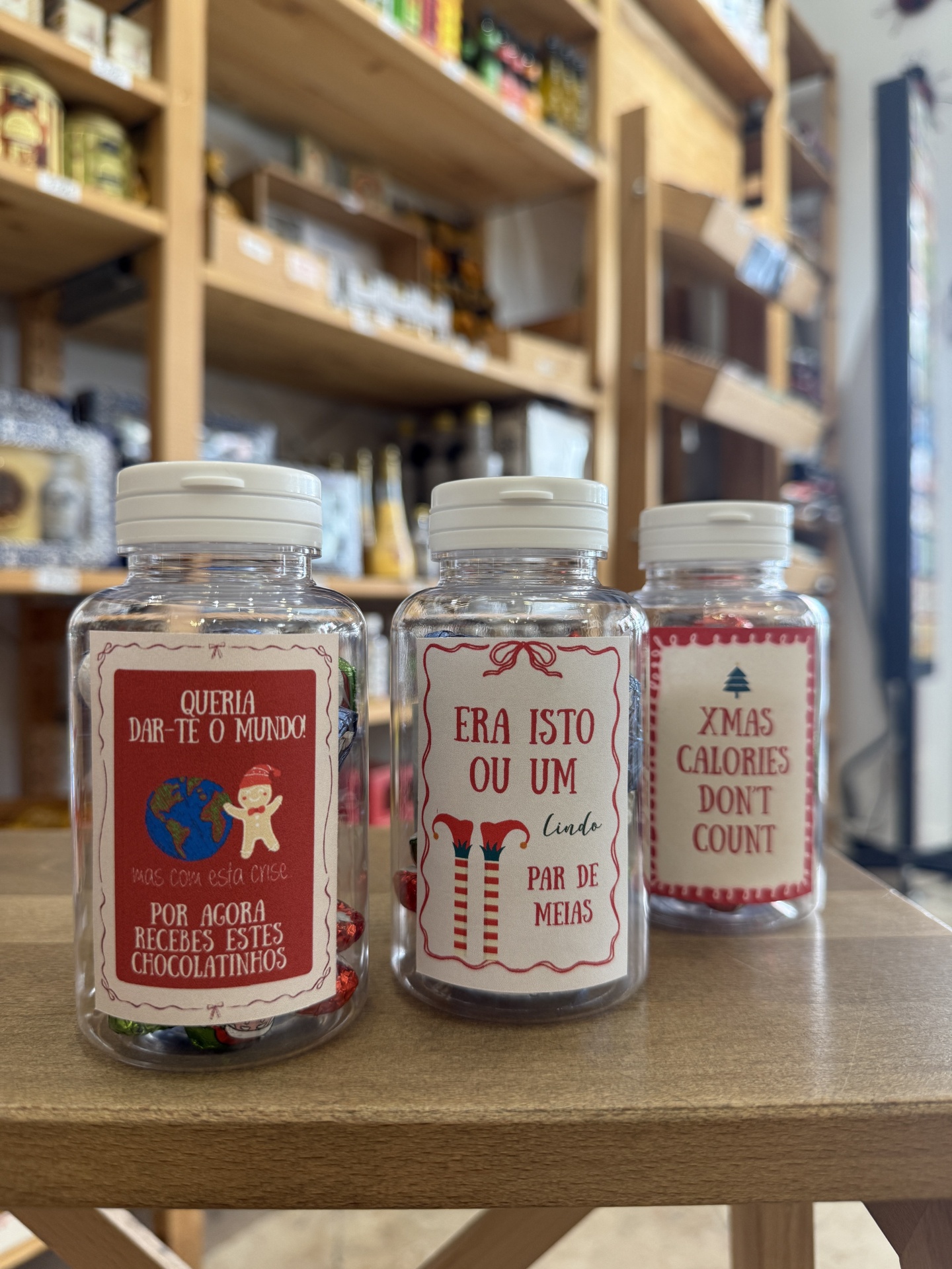 • Três frascos de plástico com chocolates e etiquetas festivas numa mesa de madeira numa loja.