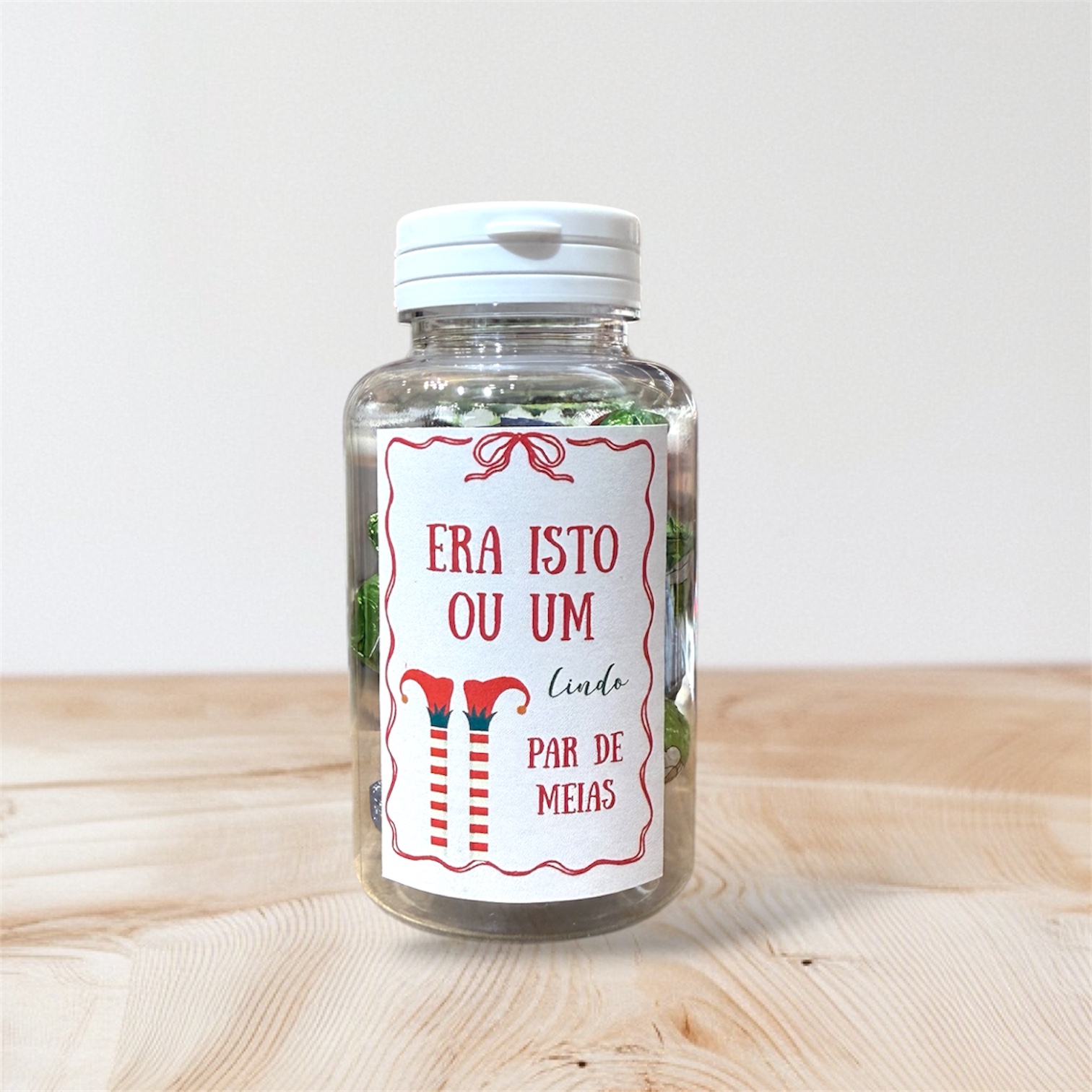 • Frasco transparente com doces coloridos e rótulo de Natal