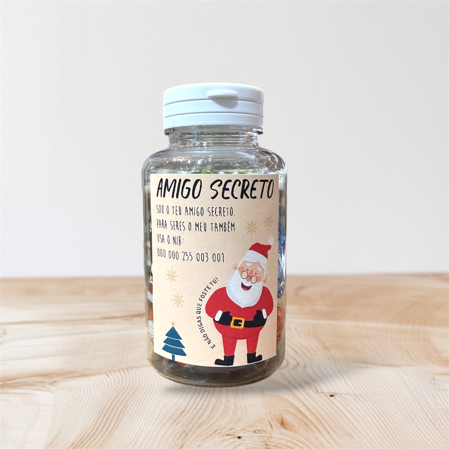 • Frasco transparente com etiqueta de amigo secreto e imagem de Pai Natal