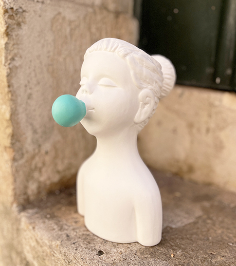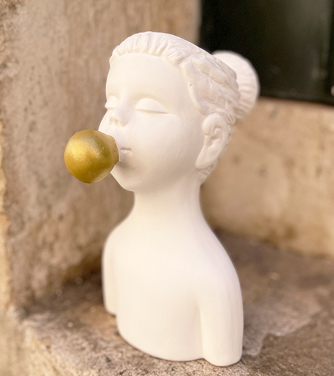 • Busto feminino branco com bolha dourada na boca sobre superfície de pedra