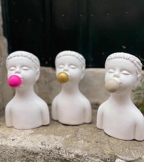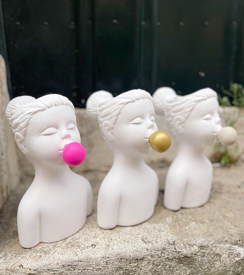 • Três esculturas brancas de bustos com bolas coloridas na boca colocadas sobre pedra