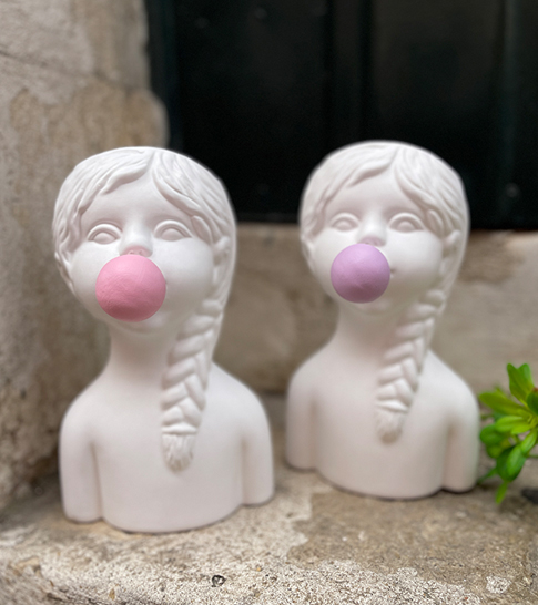 • Esculturas de busto feminino em cerâmica branca com bola de chiclete colorida
