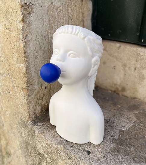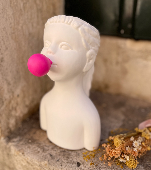 • Busto branco com bola de massa rosa na boca, em superfície de pedra com flores secas ao lado.