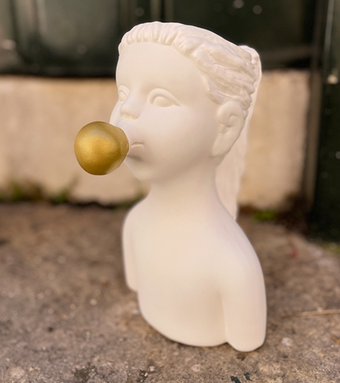 • Estátua branca de busto infantil com bola dourada na boca, em ambiente exterior