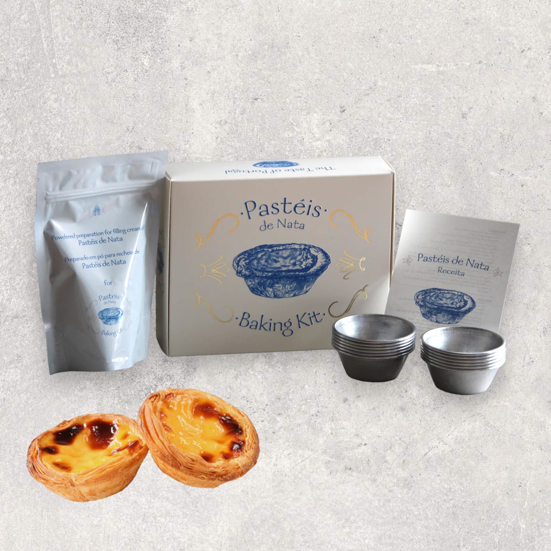 • Kit de pastelaria com caixa branca, embalagem prata, moldes metálicos, folheto e dois pastéis de nata.