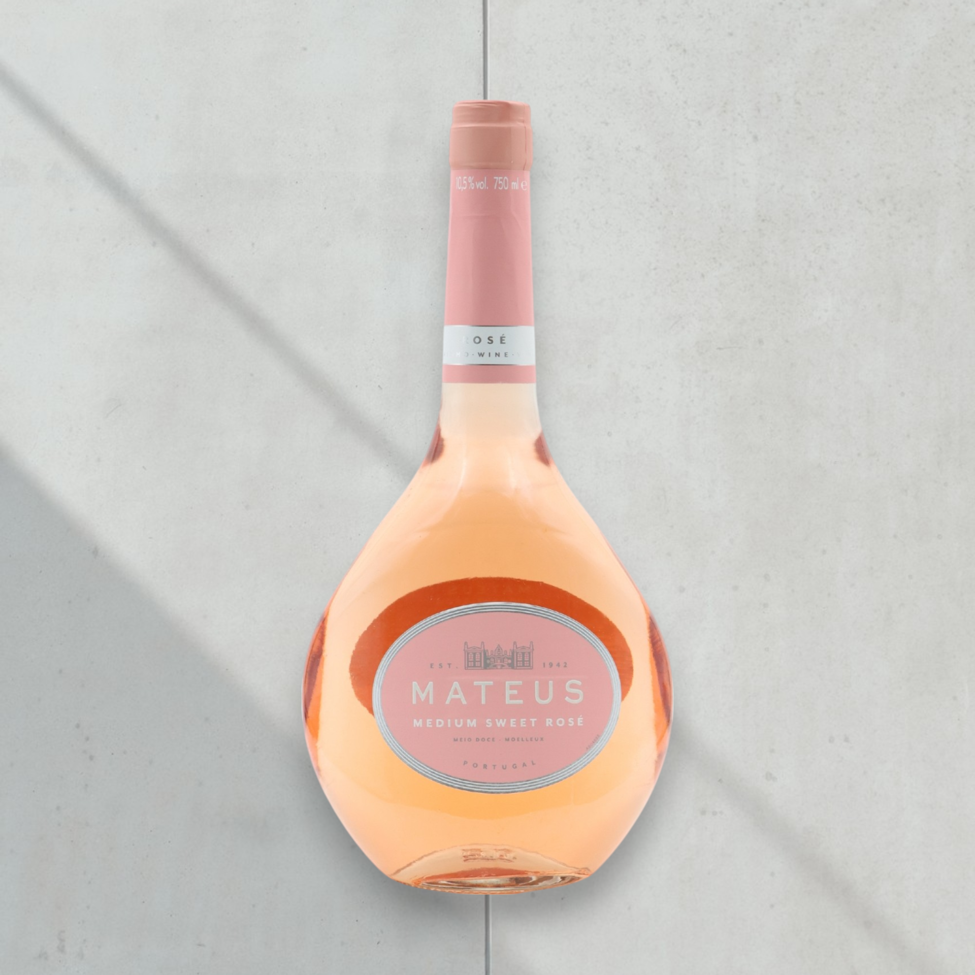 • Garrafa de vinho rosé Mateus Medium Sweet Rosé com rótulo rosa