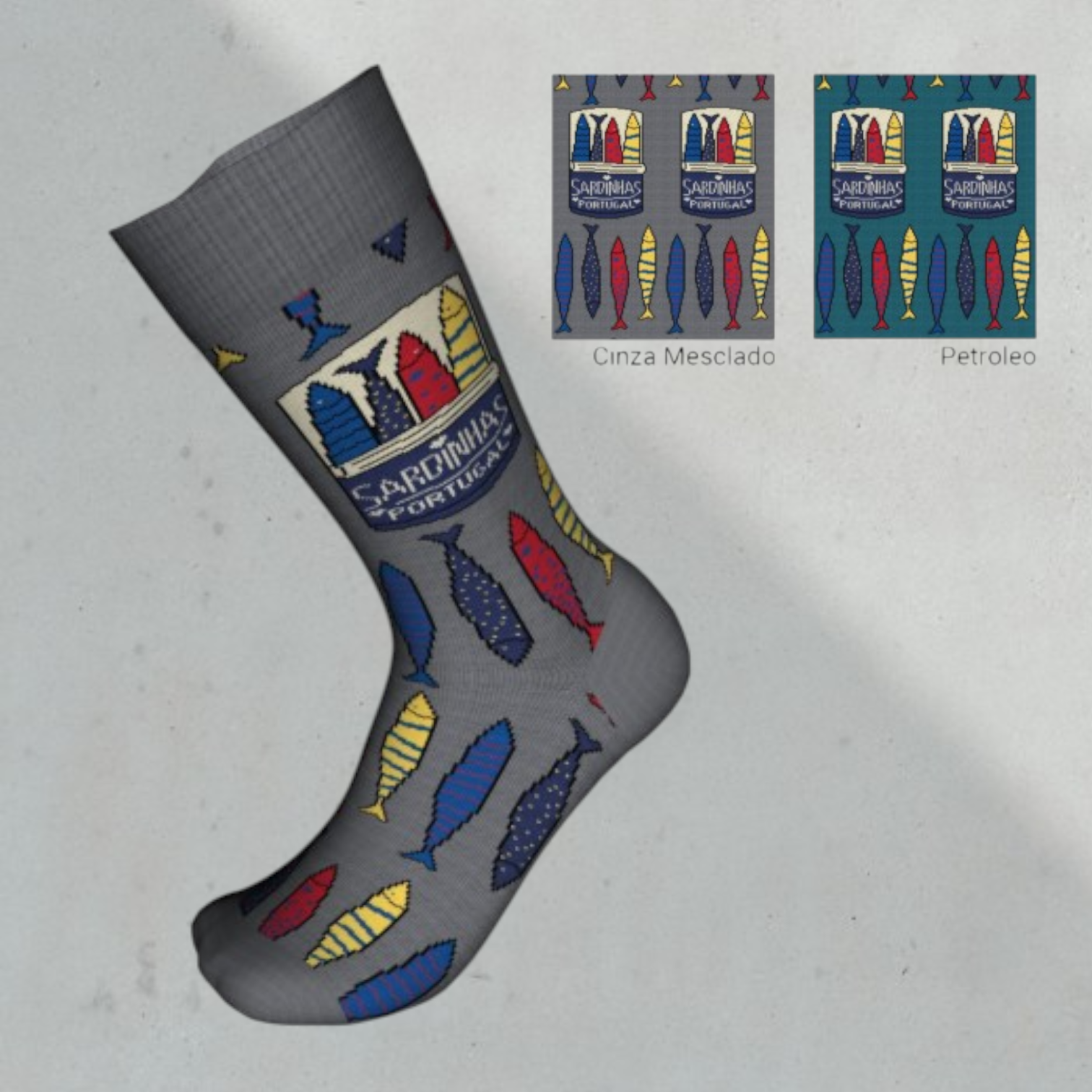 Meia cinza com padrão colorido de peixes e etiqueta azul SARDINHAS PORTUGUESAS