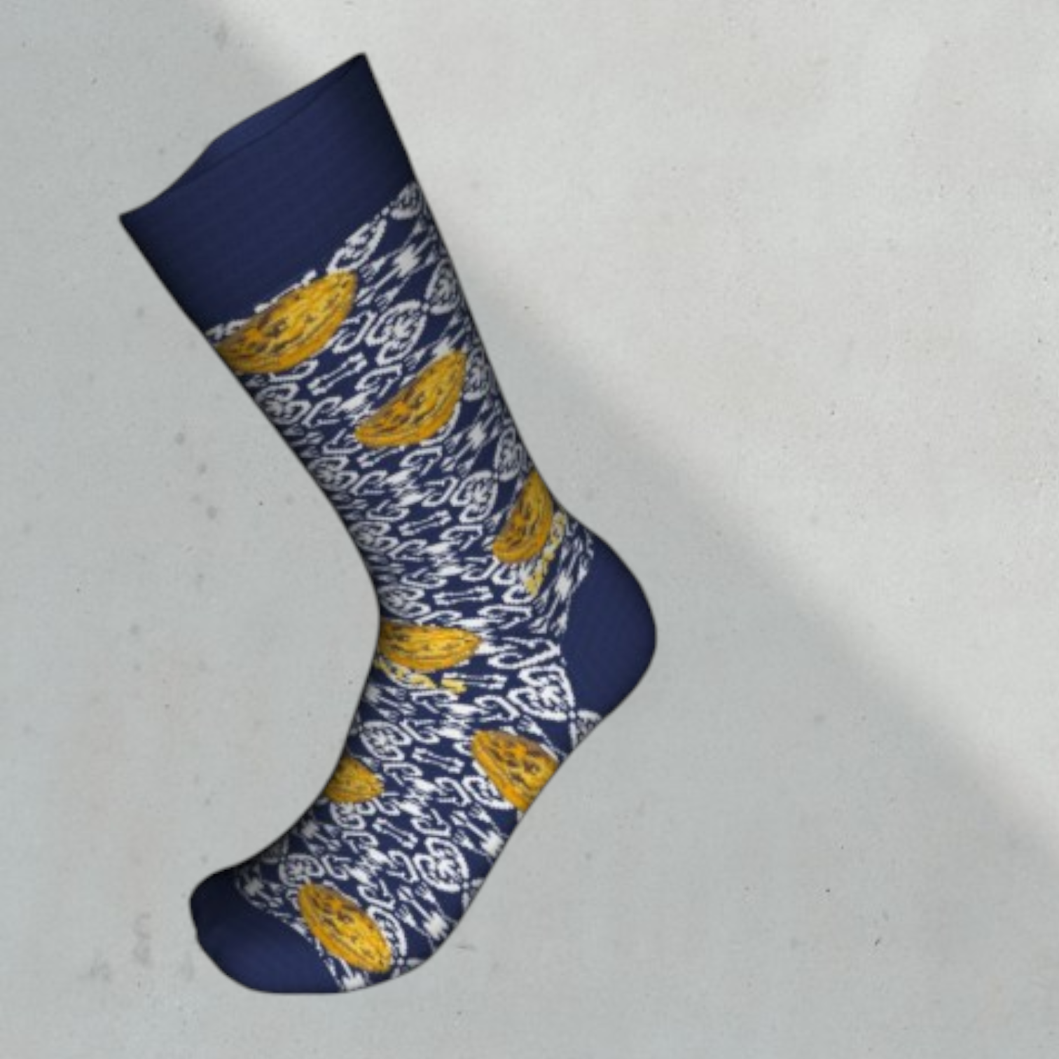 Meia azul escura com padrão branco e amarelo
