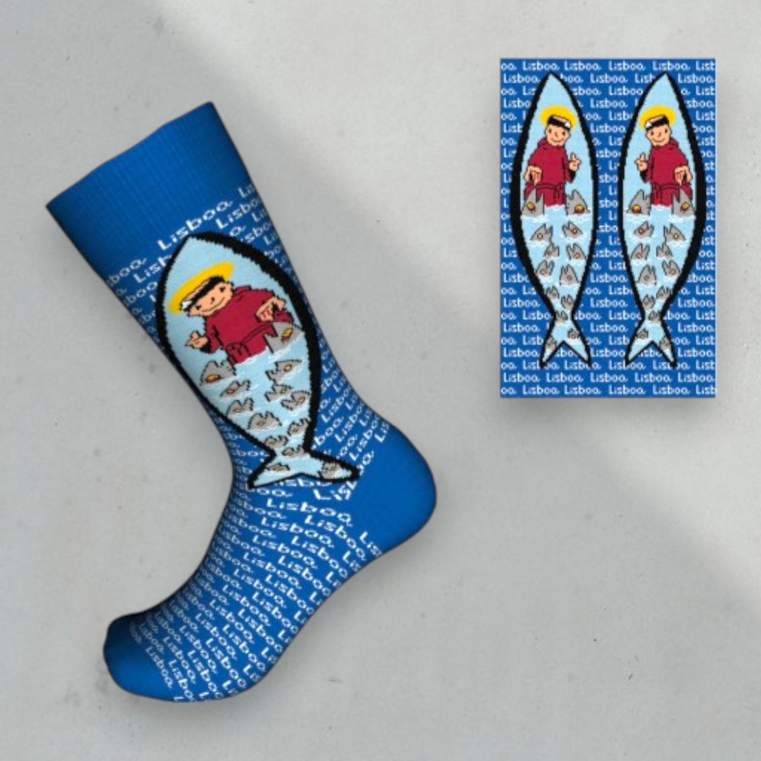 • Meias azuis com padrão Lisboa e ilustração de pessoa e peixes