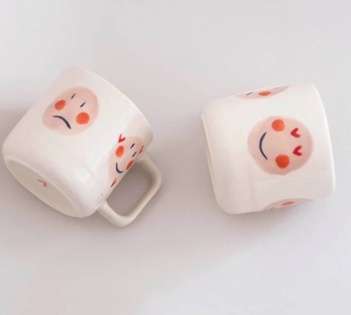 Cada caneca apresenta rostos adoráveis, desenhados à mão, que expressam diferentes emoções, como felicidade, tristeza, excitação e muito mais, juntamente com corações vermelhos comoventes, tornando cada peça única - não há duas canecas exatamente iguais.