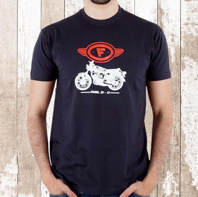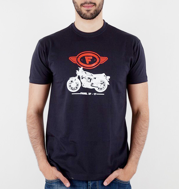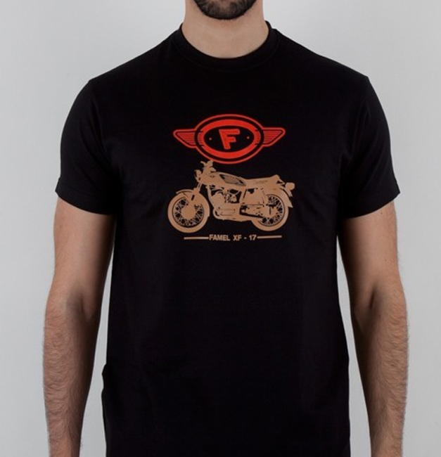 • T-shirt preta com motocicleta estampada e texto FAMEL XF - 17