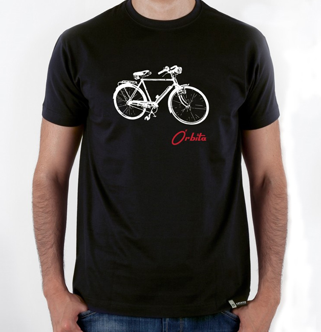 T-shirt preta com estampa de bicicleta branca e texto vermelho Órbita