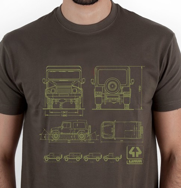 • T-shirt castanha com desenhos técnicos amarelos de um jipe e logótipo