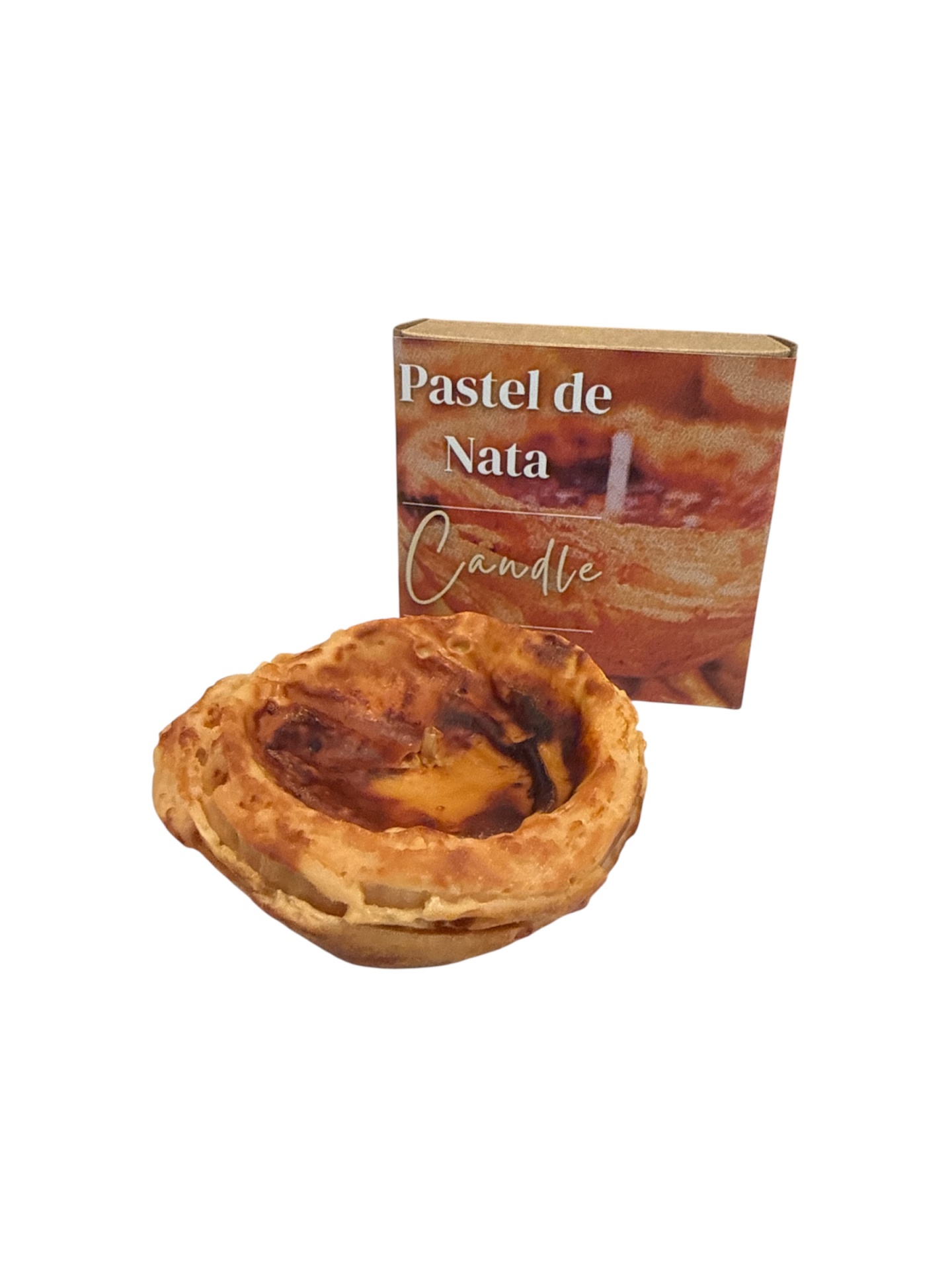 • Vela em forma de pastel de nata com caixa ao fundo.