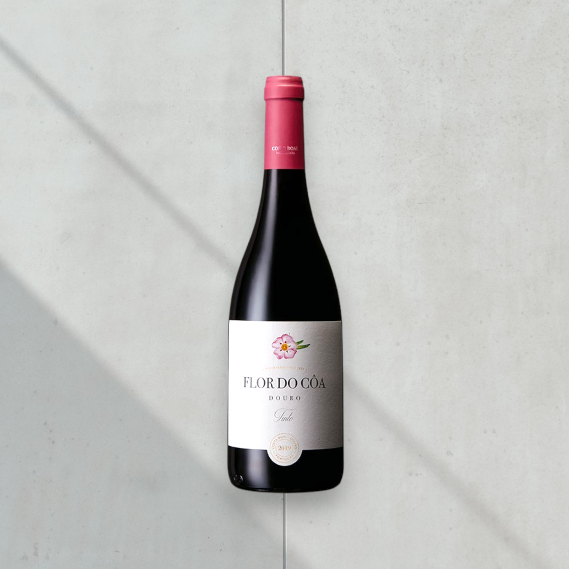 • Garrafa de vinho FLOR DO CÔA com rótulo branco e tampa rosa num fundo cinzento