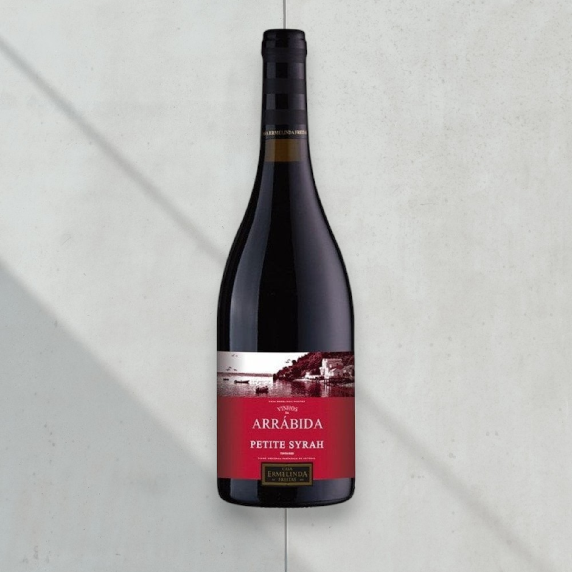 • Garrafa de vinho tinto Arrábida Petite Syrah com rótulo vermelho e branco